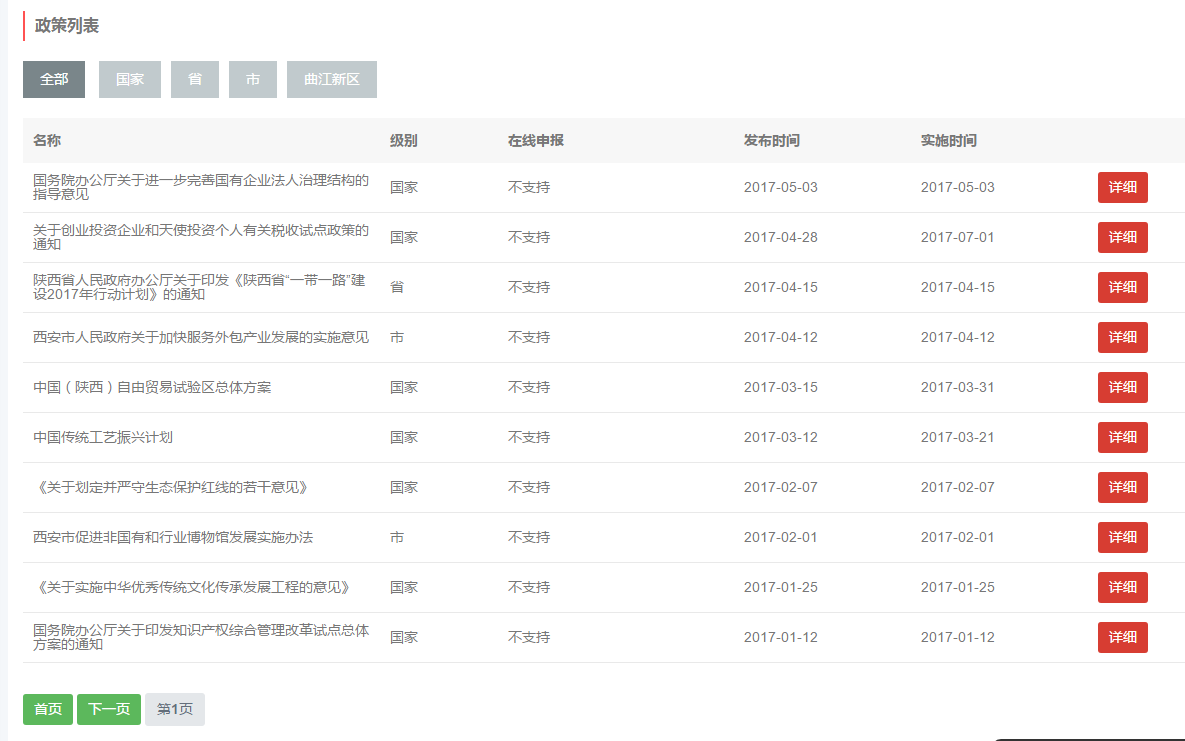 企业可以在这里查看最新的国家、陕西省、西安市、曲江新区的政策,如下图所示